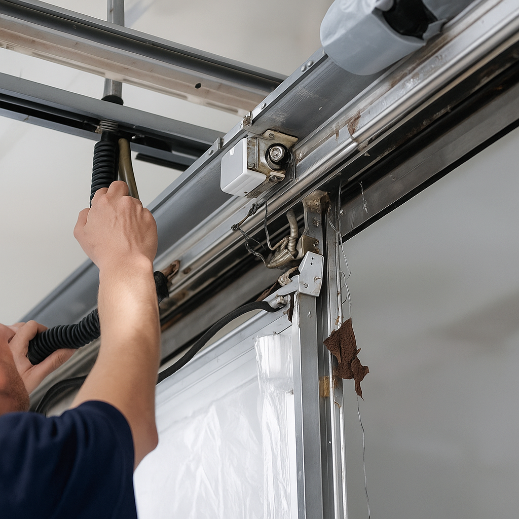 Technician adjusting or repairing wiring and components on a metal garage door mechanism.